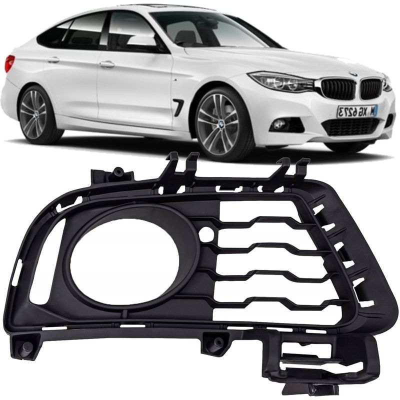 Descrição da peça: A grade moldura do farol de milha do para-choque dianteiro, lado direito - passageiro, é responsável por acomodar e proteger o farol de milha, além de complementar o acabamento frontal do veículo. Desenvolvida especificamente para a versão 328i GT M Sport, mantém o visual esportivo original de fábrica e contribui para a proteção contra pequenos impactos e detritos do uso diário. Fabricada em material de alta resistência, oferece encaixe preciso, excelente durabilidade e perfeita integração ao para-choque dianteiro.